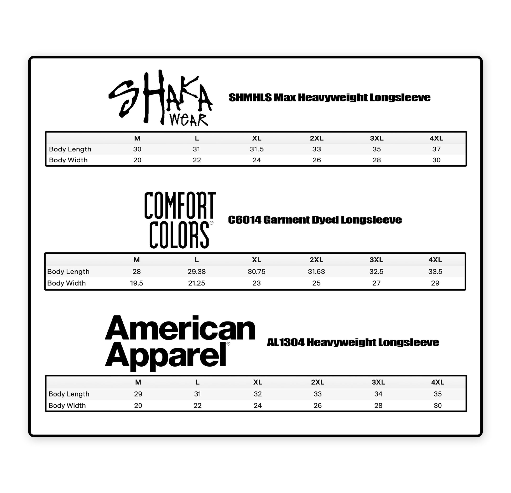 Screenprinted on Comfort Colors, Shaka Max Heavy, and American Apparel (formerly Alstyle) black and “vintage” shirts.