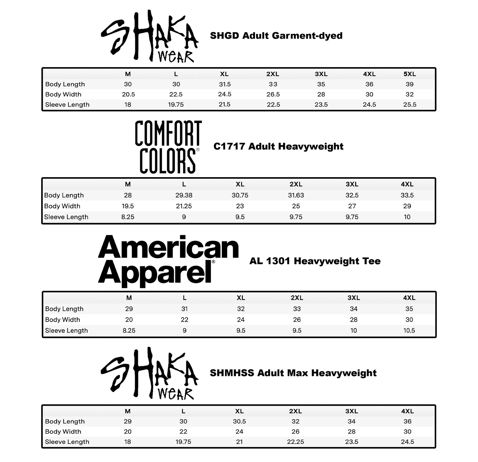 Screenprinted on Comfort Colors, Shaka Max Heavy, and American Apparel (formerly Alstyle) black and “vintage” shirts.
