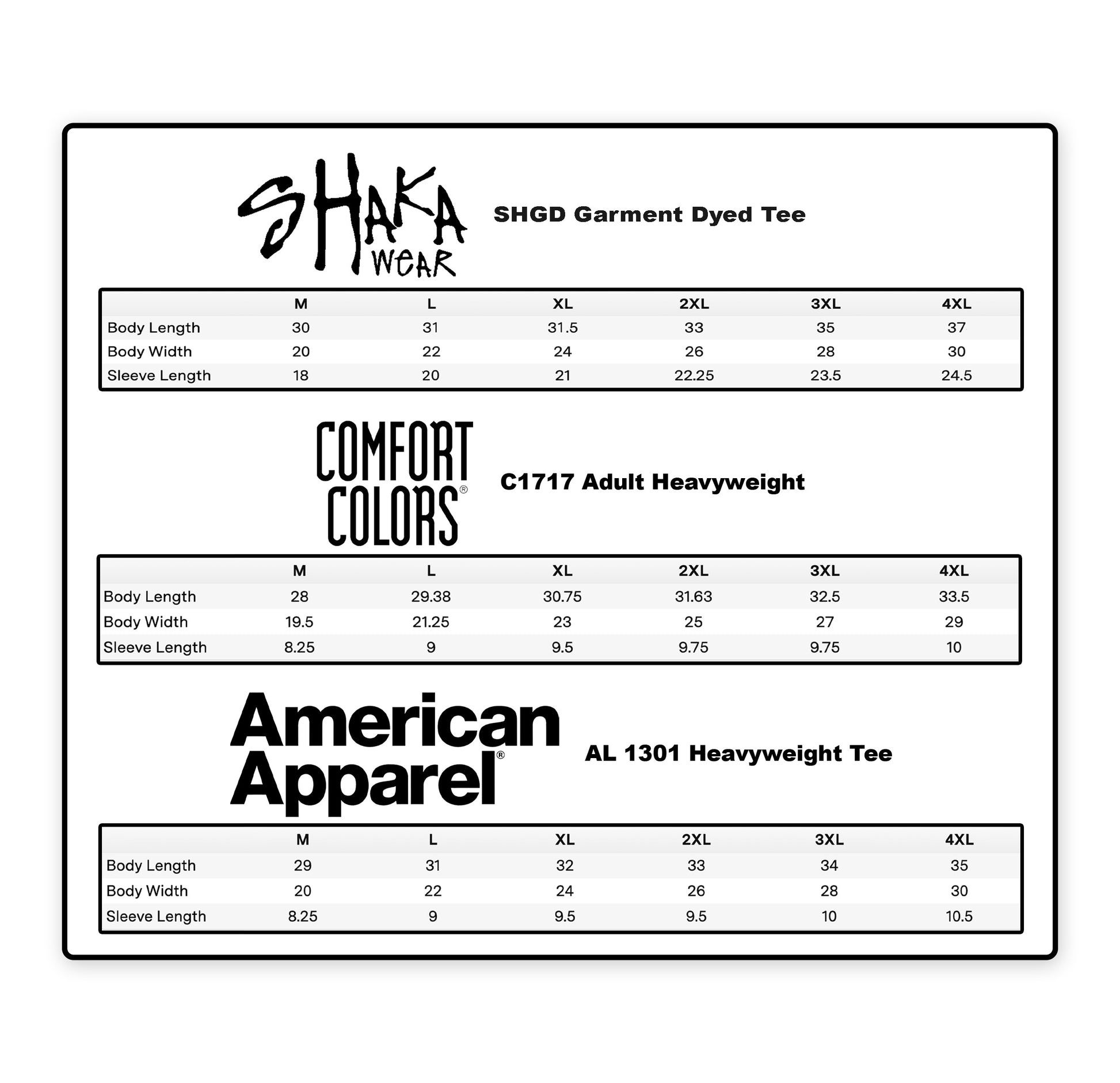 Screenprinted on Comfort Colors, Shaka Garment Dyed, and American Apparel (formerly Alstyle) black and “vintage” shirts.